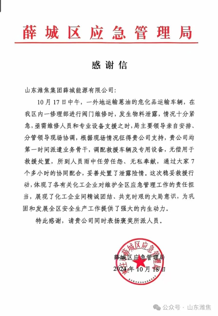 薛城能源公司收到薛城區(qū)應(yīng)急管理局感謝信